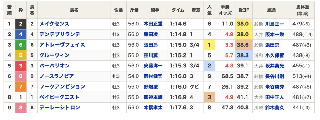 逃げた◯ベイビークエスト、2番手追走の◎バーバーリオンは息を入れるとこがなく、途中からキツイ展開になってしまい8着、5着。圧をかけ続けたアトレーヴフェイスは最後ぎり残しての3着。差し展開になってしまいましたね・・・。1着、2着はどちらもディープの血が入っており、一発あるとピックアップしたメイクセンスが6番人気ながら1着・・・。ディープ馬連BOXとかは抑えとしてアリだったかもな。。
