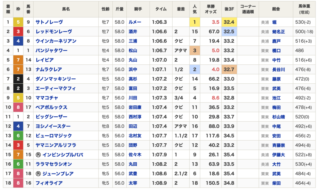 ◎ナムラクレア(6着)はとにかくスムーズに競馬ができなかった。スタートはそれなりに出ることができて、サトノレーヴの後ろのポジションを取れそうだった時は正直勝ったと思ったが、ペアポルックスに寄られたことで、ポジションを一つ落とし、レッドモンレーヴの後ろに。4コーナーではエーティーマクフィなど余力のない馬たちに進路を塞がれ、スムーズにいかず。ポジションさえ取れていたら。スムーズに追い出せていたら、レッドモンレーヴには負けていないと思われるだけに悔しい結果。逆にレッドモンレーヴのコーナリングが危ういものの、中京であの曲がり方をしたら大体は届かないというもの。それでも2着なのだから、改めて強い馬だと実感。東京だけじゃないのね・・・・。